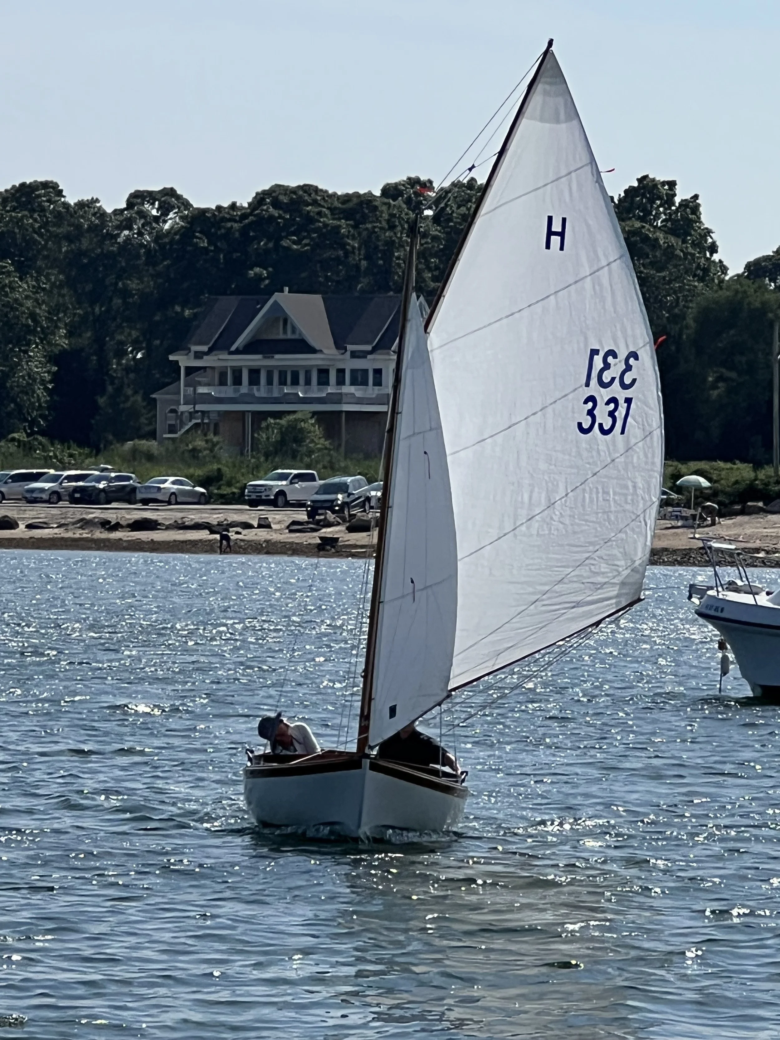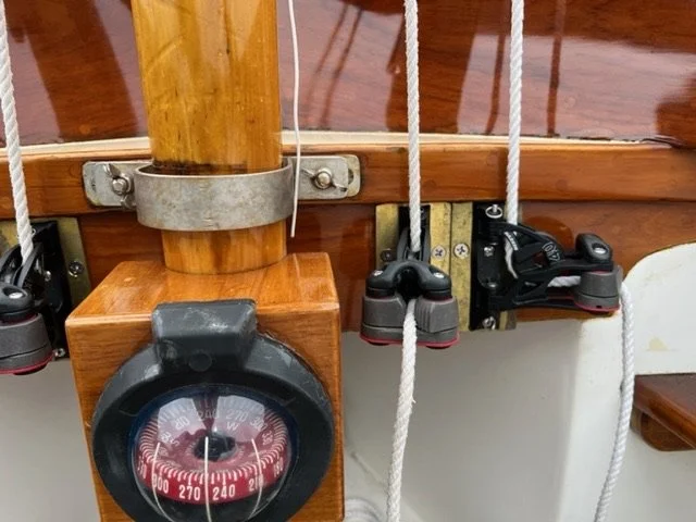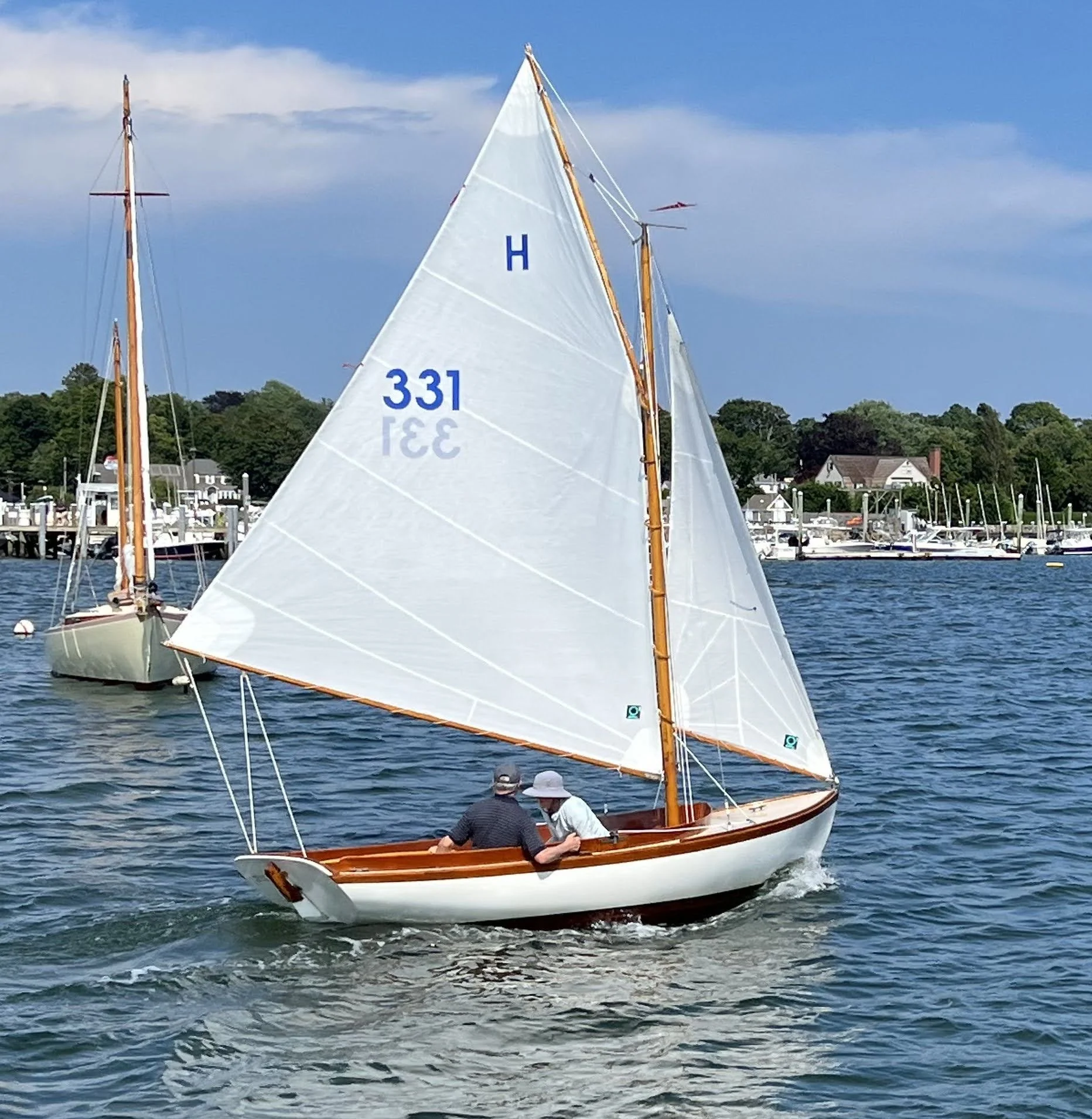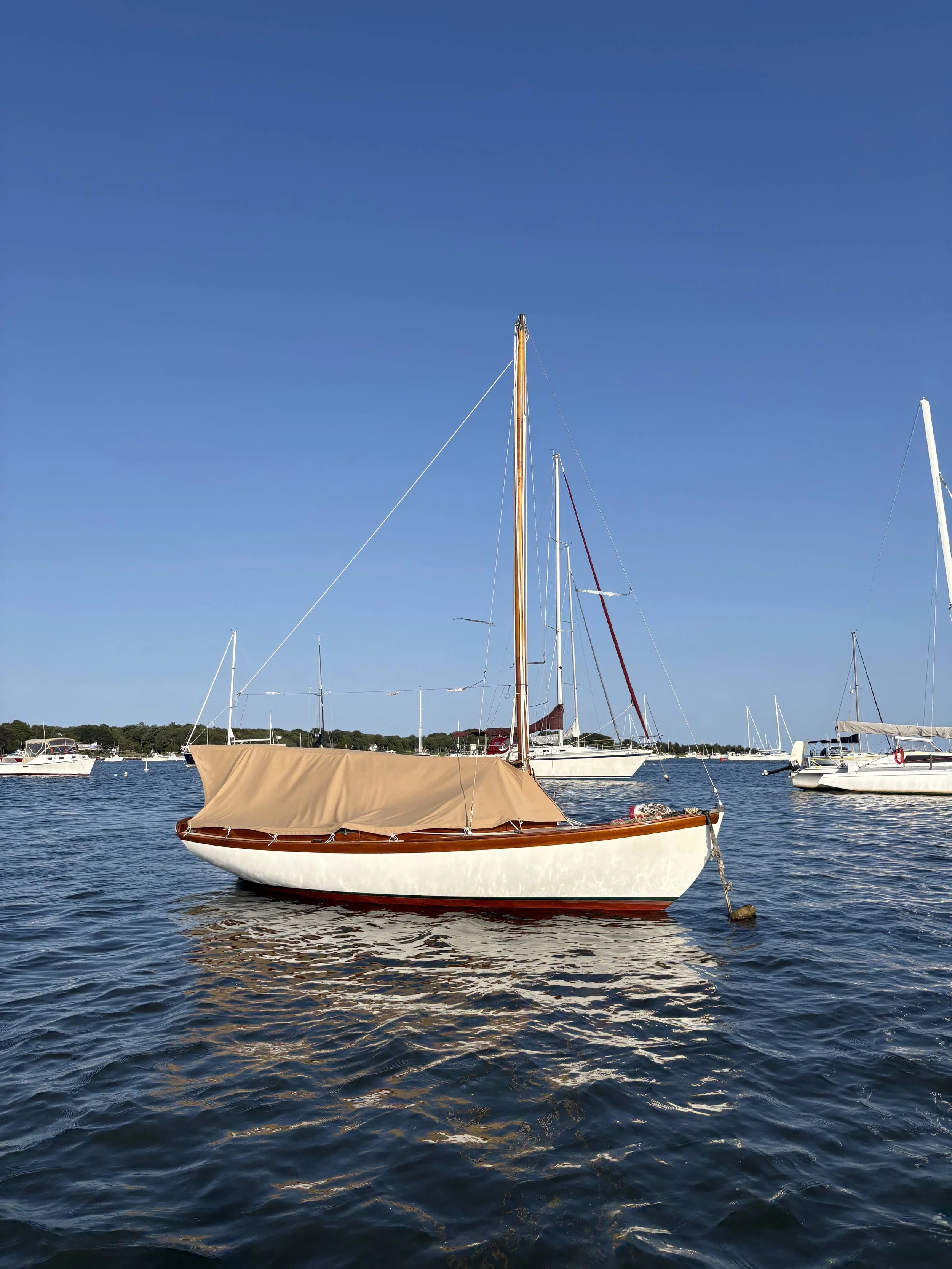 Doughdishes are constructed of foam sandwich fiberglass with teak trim. They are built with the exact dimensions, weight, balance and rig of the original sloops designed by N. G. Herreshoff. As part of the H Class, Doughdishes compete directly against wooden Herreshoff 12 1/2’s in one-design class racing and regattas, and the class is thriving and healthy in 2026.