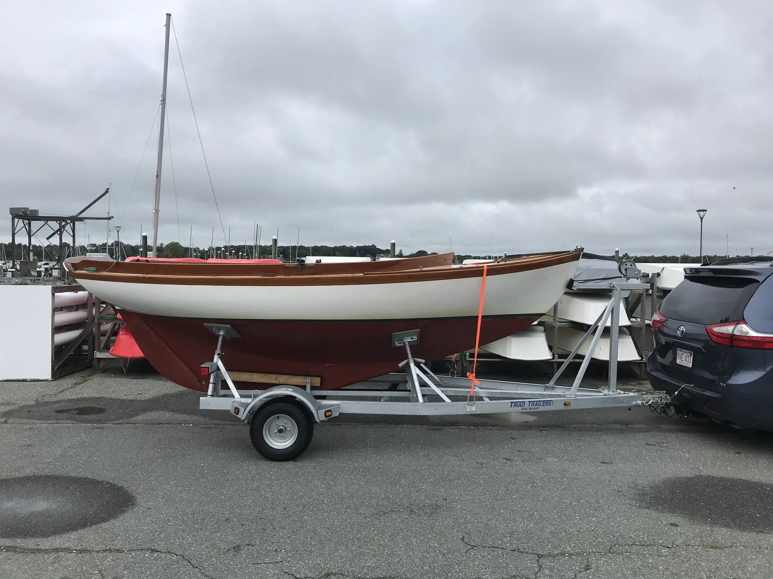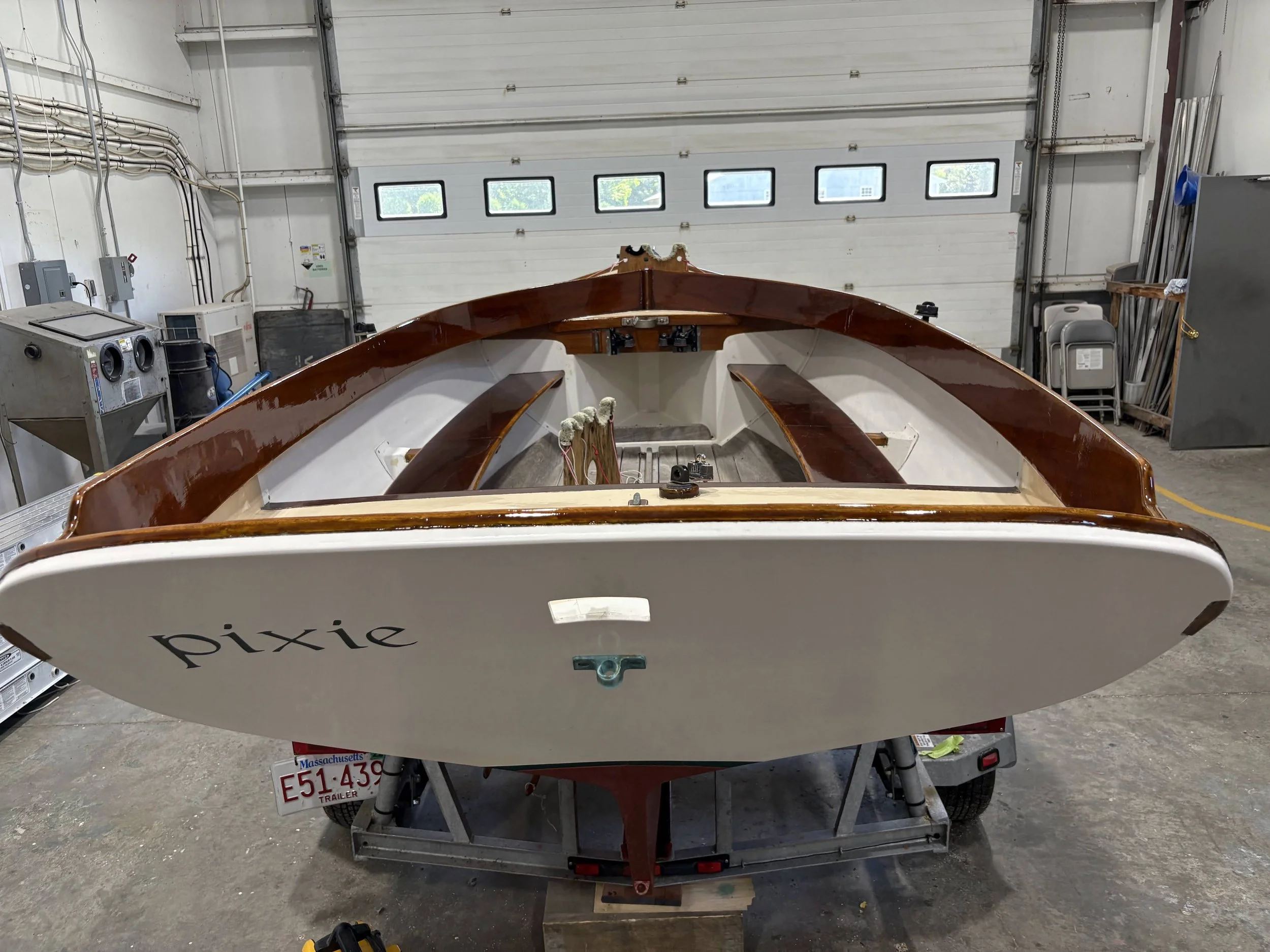 PIXIE is a professionally maintained 16’ Doughdish, a great example of the fiberglass version of the Herreshoff 12 ½ design from 1914. PIXIE comes with a 2022 “float-on” trailer, which enables the boat to be launched from most boat ramps, alleviating the need for a boatyard or hoist. Another highlight is her lightly-used suite of sails, and she comes ready to race, with upgrades including a spinnaker pole and swivel cam cleats. Her brightwork was recently redone by Concordia Company.